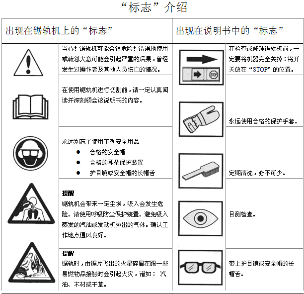 在使用一臺(tái)新的鋸軌機(jī)前: l 從頭至尾,認(rèn)真閱讀操作手冊(cè)。 l 檢查鋸片的安裝及調(diào)整。詳見(jiàn)“安裝”一章。 l 啟動(dòng)發(fā)動(dòng)機(jī)并檢查化油器是否調(diào)節(jié)無(wú)誤。見(jiàn)“保養(yǎng)”一章中“化油器”一節(jié)在空氣/汽油混合正確的情況下,鋸片的停止應(yīng)該是慢慢減速直到最后靜止。緩慢減速的調(diào)節(jié)在手冊(cè)中有說(shuō)明。對(duì)運(yùn)轉(zhuǎn)狀態(tài)的調(diào)節(jié)應(yīng)按此說(shuō)明正確調(diào)節(jié)。在緩慢減速狀態(tài)未正確調(diào)好時(shí),請(qǐng)不要使用鋸軌機(jī)! l 請(qǐng)讓您的Husqvarna的銷(xiāo)售商來(lái)負(fù)責(zé)必要的機(jī)器維修及調(diào)節(jié)。