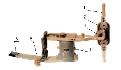 基本結(jié)構(gòu):1手把、2彈性把座、3調(diào)整板、4電機(jī)殼、5鎬板、6搗固爪